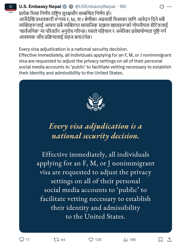 The U.S. Embassy in Nepal has already begun informing the public about this updated policy, which has sparked a degree of confusion and concern among Nepali students aspiring to pursue their studies in the U.S. In response, educational consultants are now actively advising students to thoroughly review and “clean up” their social media profiles, recommending the removal of any content that might be perceived as controversial.